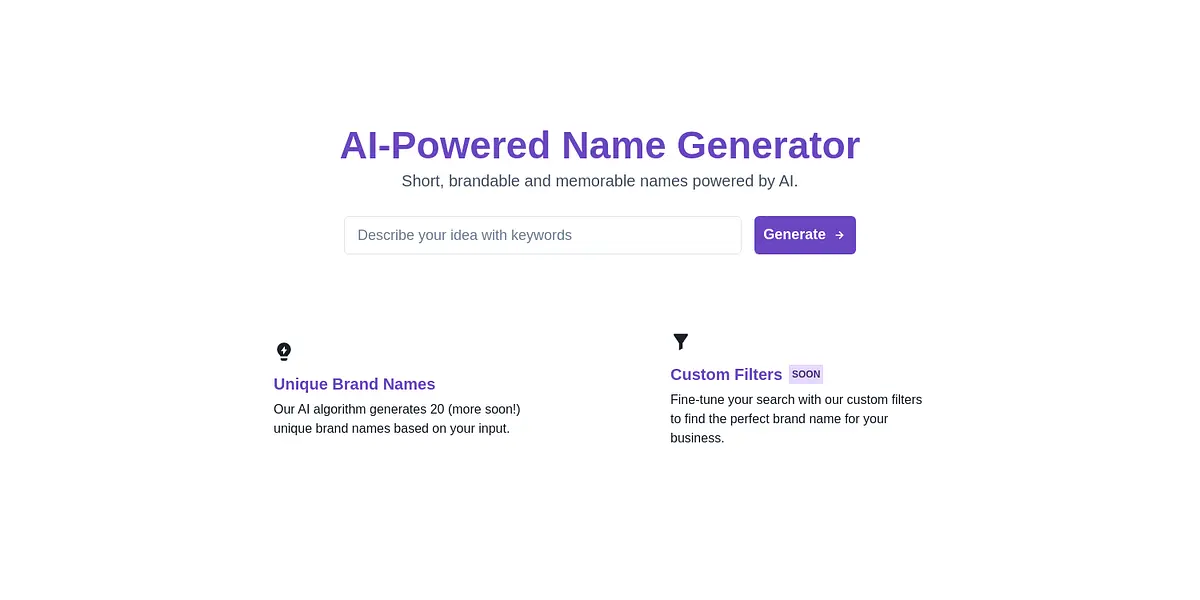 Generate unique and catchy brand names with an AI-powered name generator. Use custom filters to find the perfect name for your business.