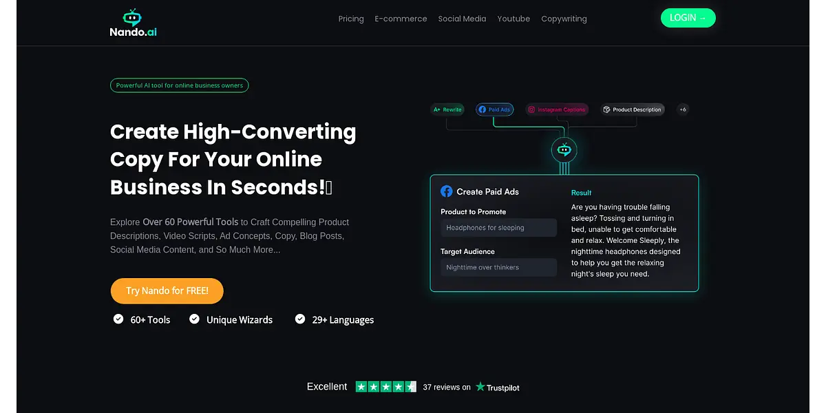 Nando AI is an AI-powered, all-in-one solution for time-saving, cost-effective, and high-converting copywriting. Designed for platforms such as e-commerce, Nando AI streamlines the copywriting process with over 60 powerful tools to help entrepreneurs create compelling product descriptions, video scripts, ad concepts, copy, blog posts, and social media content. With expertly crafted copy, Nando AI can transform your e-commerce content game by generating proven high-converting Facebook Ads copy and optimizing ad copy for maximum performance. The platform learns from your past campaigns to write the best possible ads and crafts your ideal brand voice and message on social media. For YouTube creators, Nando AI creates high-converting copy for videos to help promote products and drive organic traffic to your store. Nando AI also offers AI-powered rewriting to help achieve writing perfection and takes your words to the next level. Nando AI is a cost-effective solution, eliminating the need for expensive agency fees, and can help increase sales by creating a compelling and high-converting copy. Its a user-friendly interface and easy-to-use features make it accessible for users who may not have a lot of experience with copywriting. With customizable options to suit specific needs and preferences, Nando AI provides access to the expertise of professional copywriters. Nando AI is the perfect all-in-one solution for creating product descriptions, ad texts, and video scripts, streamlining the marketing process, and eliminating costly team expenses. Sign up for a free 5-day trial today to experience lightning-fast copywriting at your fingertips with Nando AI.