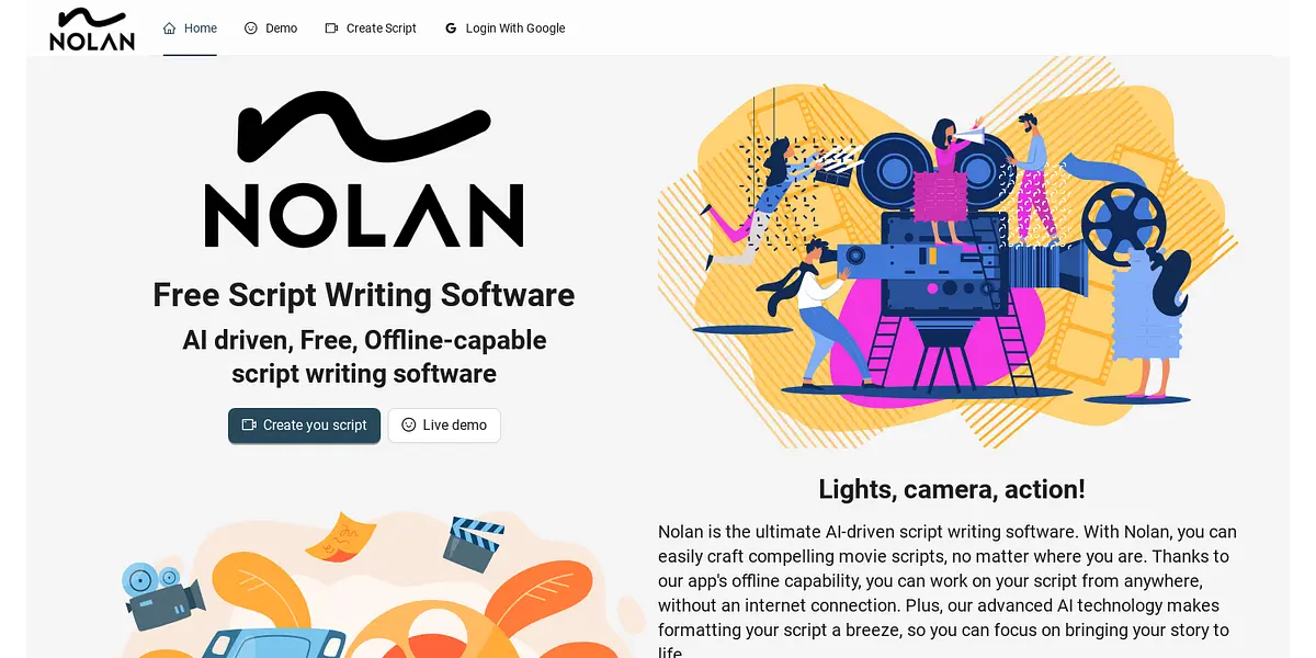 Nolan is a free, offline-capable script writing software that employs advanced AI technology to help screenwriters craft compelling movie scripts anytime and anywhere. With Nolan's intuitive interface, writers can easily create their stories in a distraction-free environment without worrying about format or style. Nolan's advanced AI technology streamlines the script formatting process, allowing writers to focus solely on their creative writing process. Its offline capability makes it easy for writers to work on their scripts without requiring an internet connection. Nolan is the ultimate choice for those looking to become a successful screenwriter, and with its live demo feature, writers can experiment and perfect their skills.