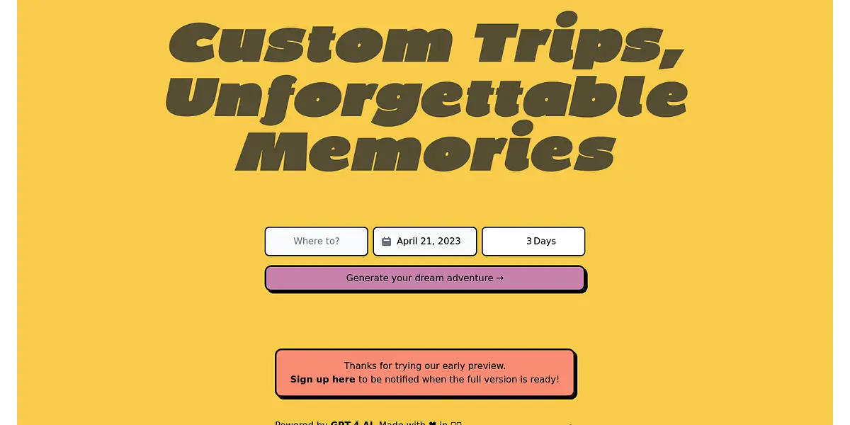 Plan your dream adventure with customized trips and create unforgettable memories. Powered by GPT-4 AI, this platform can help you design the perfect itinerary for your dream vacation. Sign up now to be notified when the full version is ready!