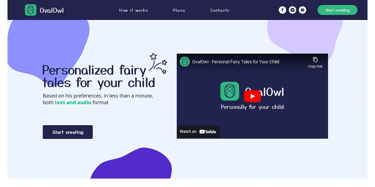 OvalOwl is a service that lets you create personalized fairy tales for your child in both text and audio format, based on their unique preferences. With just a few clicks, you can bring their imagination to life and give them a therapeutic, educational, and fun experience like never before. Choose from a range of plans and get started today!