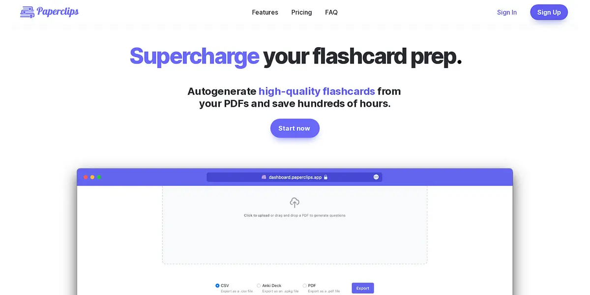 Paperclips saves hours of time by generating high-quality flashcards from your digital notes that can be exported to popular platforms. With seamless integration with note-taking apps, it is perfect for students of all levels and subjects.