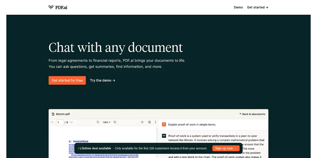But don't take our word for it - try it for yourself! PDF.ai offers a free demo that allows users to upload a document and start chatting with it today. No credit card is required, making it risk-free to try. For users wanting to take advantage of the platform's full range of features, lifetime deals are available to the first 100 customers.