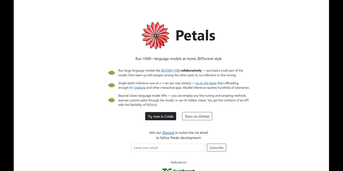 Petals allows users to collaborate in running large language models like BLOOM-176B at home, for faster single-batch inference and parallel inference capabilities. The platform offers flexibility beyond classic language model APIs, allowing for custom paths through the model and access to hidden states. Follow the development progress by subscribing via email or joining the Discord community.
