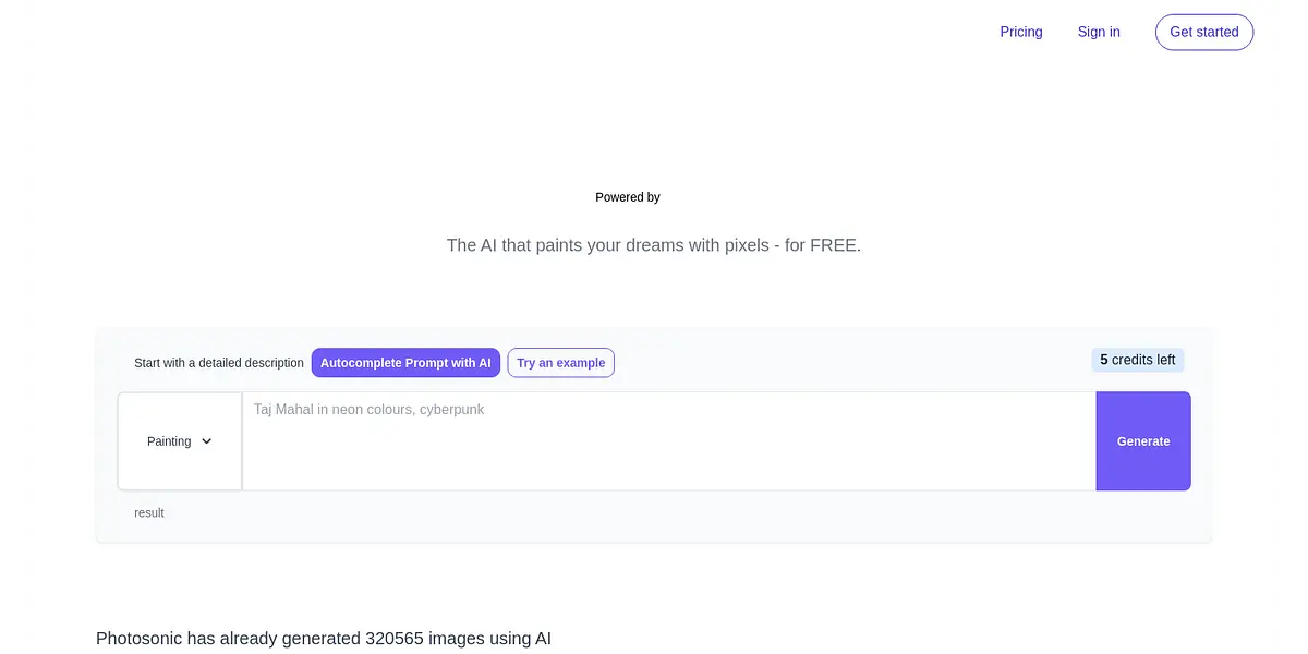Photosonic is a free platform that allows you to create as many images as you want, without any limitations. With its user-friendly interface, you can start creating images as soon as you sign in. You can try out an example and generate five credits of your own. With this platform, you have access to a vast library of images that have already been generated, including Editor's Picks and Recent Generations.