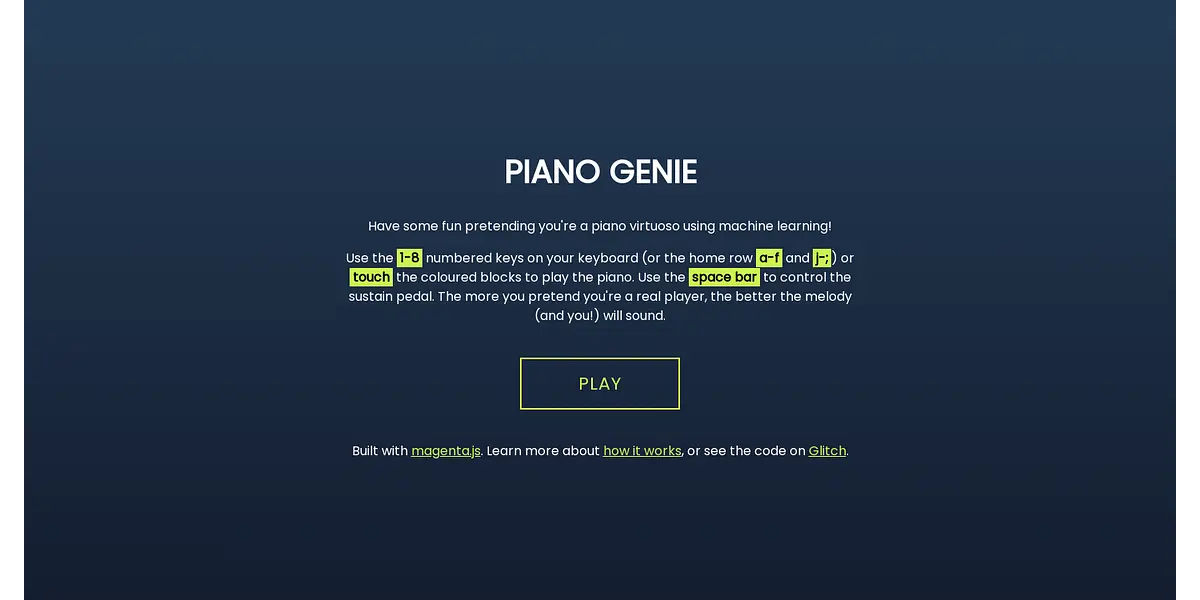 Are you a music lover looking for a fun and easy way to unleash your inner piano virtuoso? Meet Piano Genie, the online tool that lets you play beautiful piano melodies with the touch of a key. What's more, Piano Genie is built using Magenta.js and is powered by cutting-edge machine-learning technology, meaning the more you play, the better it gets!