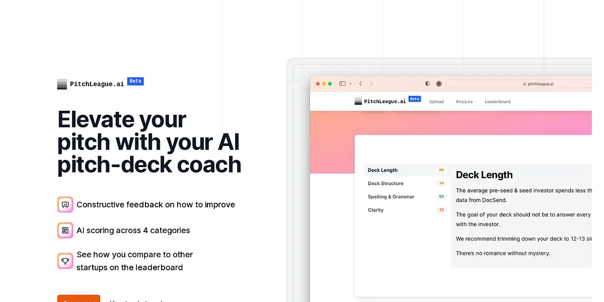 Get constructive feedback on how to improve your pitch deck's AI scoring in four categories with PitchLeague.ai. Ideal for Pre-Seed and Seed stage startups, it's designed to give feedback on investor introduction decks. Upload a file or drag and drop PDF up to 10MB and see how you compare to other startups on the leaderboard.