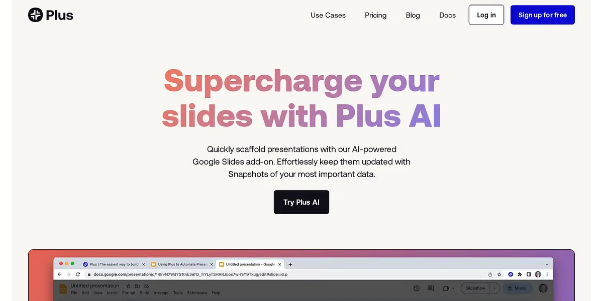Plus AI allows you to effortlessly capture and embed always-up-to-date screenshots of any website or app into your presentations and dashboards. With features like self-updating slide decks, personal dashboards, and easy sharing with teams, Plus AI simplifies data aggregation and reporting, saving you hours of work each week. Try Plus AI today and supercharge your productivity.