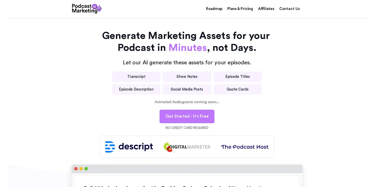 "Create marketing assets for your podcast in minutes with the power of AI technology. Transcripts, show notes, episode titles, social media posts, quote cards, and more are just a click away. Get started for free, and see what our customers already love about our service."