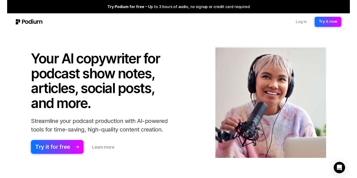 Podium helps podcasters streamline their content creation process by using AI-powered tools for generating show notes, transcripts, highlight clips, and more. With Podium, you can save time and money while reaching larger audiences. Try it for free today!