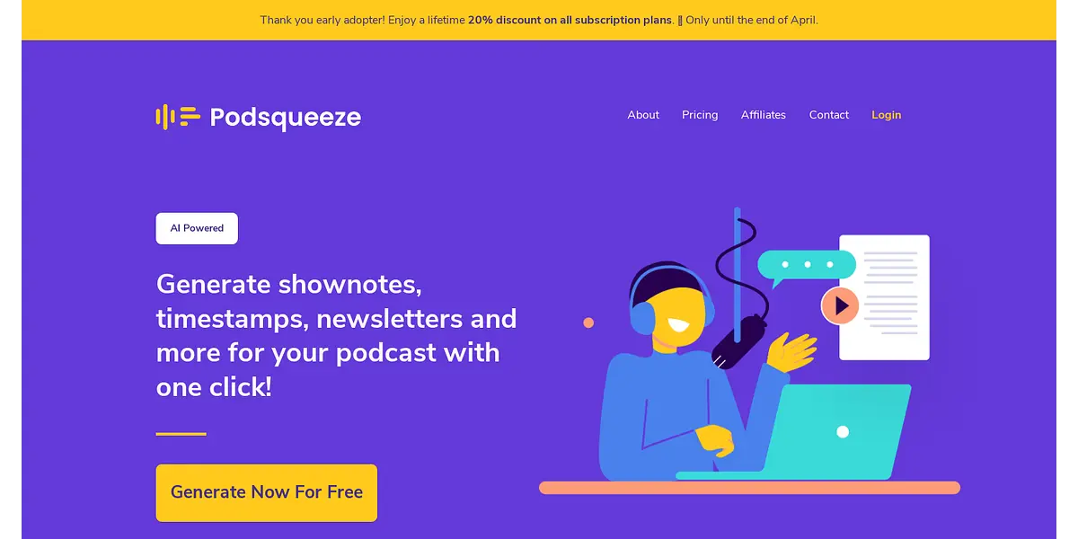 Podsqueeze is an AI-powered platform that provides automatic podcast content generation. Its AI technology helps you to generate shownotes, timestamps, tweets, newsletters, and more with one click. The platform is intuitive and user-friendly, helping podcast creators to save time by creating and fine-tuning content with ease. You can choose an episode from your RSS feed or upload an audio/video file; Podsqueeze will process your podcast and generate all the content automatically. With multiple language support, a wide variety of content types, and an interface that's easy to use, Podsqueeze is the ideal tool for all podcast creators. And, with a 20% discount available for early adopters until the end of April, there has never been a better time to try Podsqueeze.