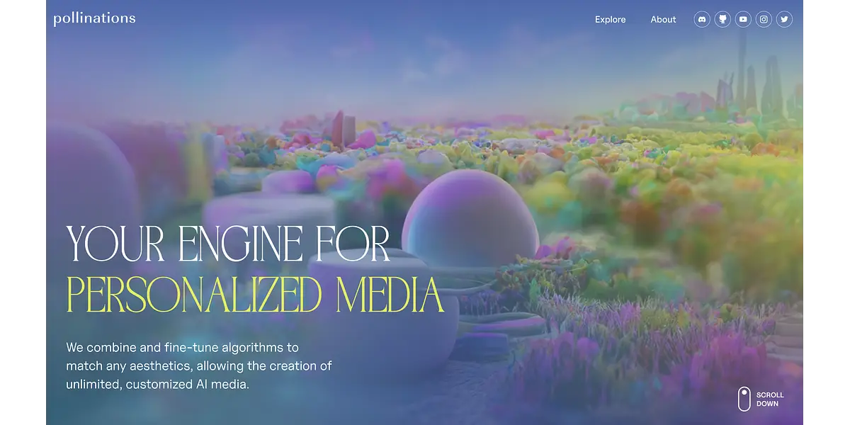 Pollinations.ai is a cutting-edge AI media platform that harnesses the power of machine learning to create personalized and unlimited media content. Whether you want to create stunning visuals, music videos, or immersive installations, Pollinations has everything you need to unleash your creativity and bring your ideas to life.