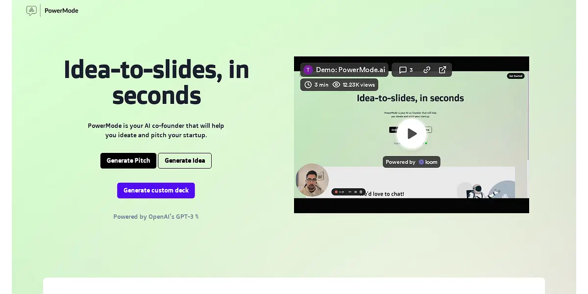 PowerMode is a revolutionary AI-powered platform that is designed to assist startups in the ideation and pitching process. Powered by OpenAI’s GPT-3, PowerMode is your virtual co-founder that can help you ideate, pitch and generate custom decks that will capture the attention of investors and stakeholders.