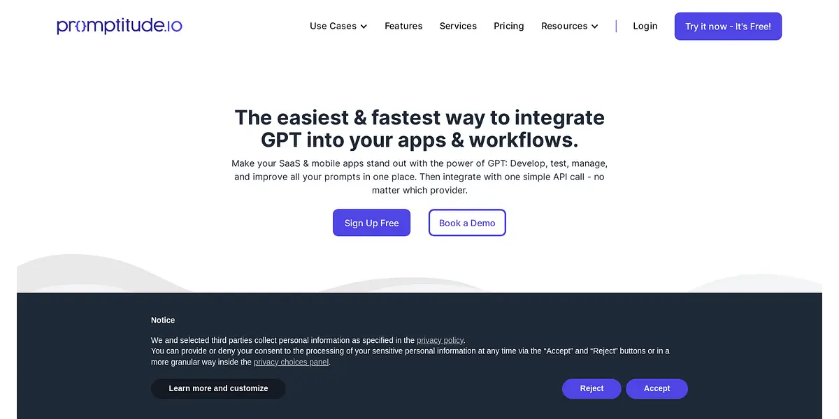 If you are a SaaS or mobile app developer looking to add powerful features like text generation, information extraction, and more to your app, Promptitude is the answer for you. Promptitude offers an easy and quick integration of GPT (Generative Pre-trained Transformer) into your apps, making it stand out among others. Manage, test, and deploy all your prompts and providers in one place and integrate with just one simple API call, no matter which provider you have.