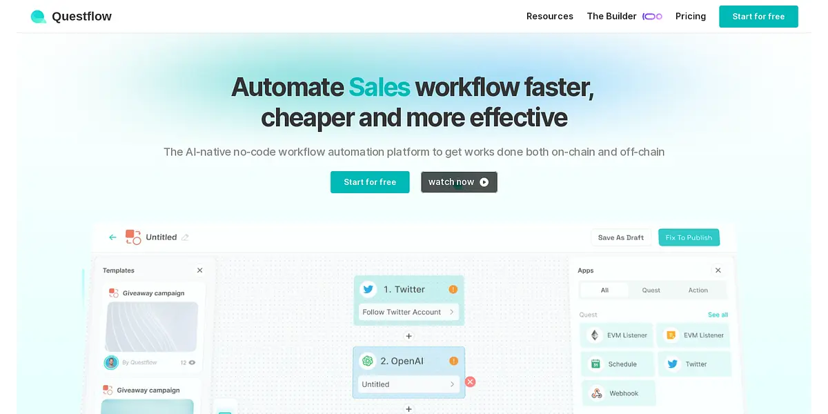 Questflow Resources offers a revolutionary no-code workflow automation platform. With its AI-native technology, designing, publishing, and streamlining workflows becomes fast, cheap, and more effective than ever. Questflow's canvas is perfect for designing workflows, while its ability to provide context for workflows on-chain, off-chain, in-app, and cross-channels simplifies complex tasks and elevates team efficiency. It also offers customizable agents, insights, segmentation, funnels, retention analysis, and bots to empower your workflow automation. Questflow is used across various fields, from marketing and sales to personal use. Start for free today and unleash your creativity!