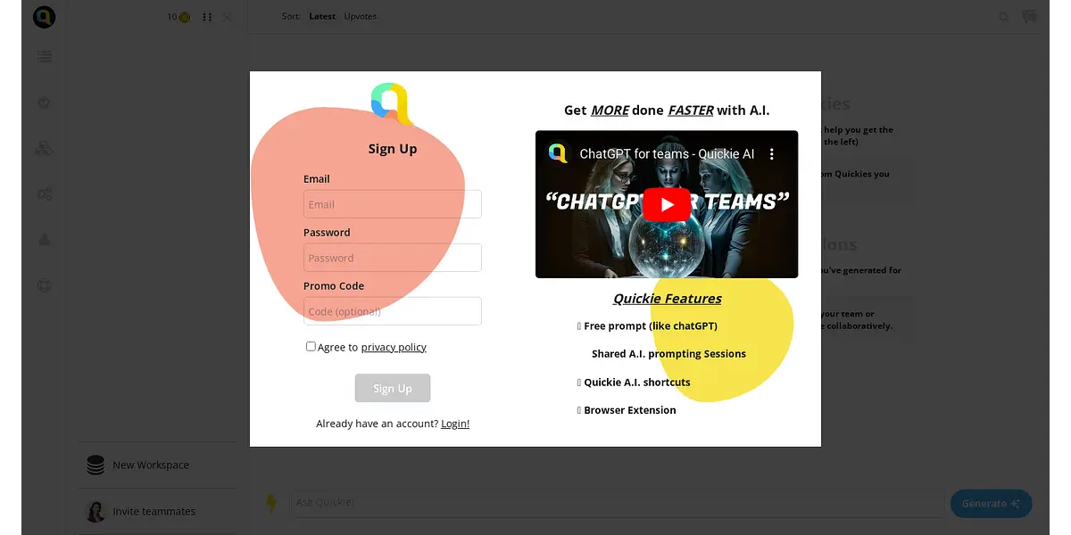 Finally, A.I. Quickie lets you create and save custom quickies that you can run anytime. This feature lets you tailor A.I. Quickie to your specific needs, making it more convenient for you to get things done. You can also invite your teammates to the workspace to share your sessions collaboratively, making it easier for you to work together more efficiently.