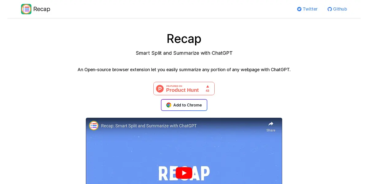 Recap your favourite articles with ease using Recap - an open source browser extension. Compatible with Google Chrome, this smart extension makes summarizing any portion of a webpage a quick one-click task. Powered by ChatGPT, it works on the principles of Artificial Intelligence and Natural Language Processing.