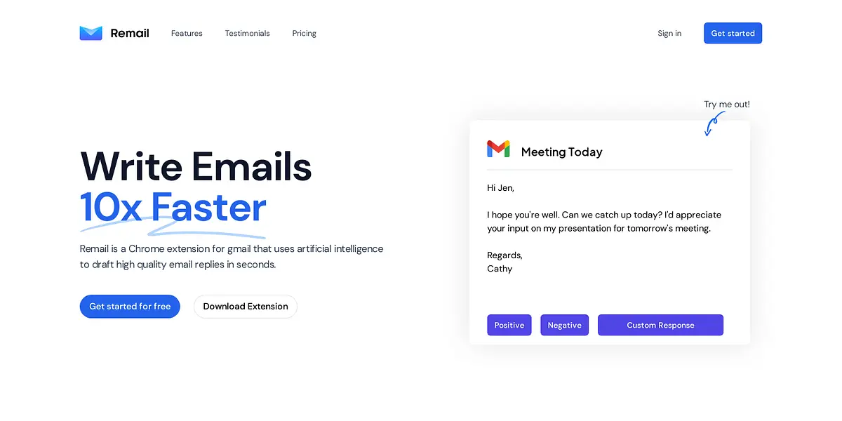 Remail is an AI-powered Chrome extension for Gmail that helps you draft high-quality email replies in seconds. Whether you're a power email user or a casual one, Remail has a plan that works for your needs. With Remail, you can quickly compose one-click positive or negative responses, write custom responses, or use scheduling links to coordinate a meeting.