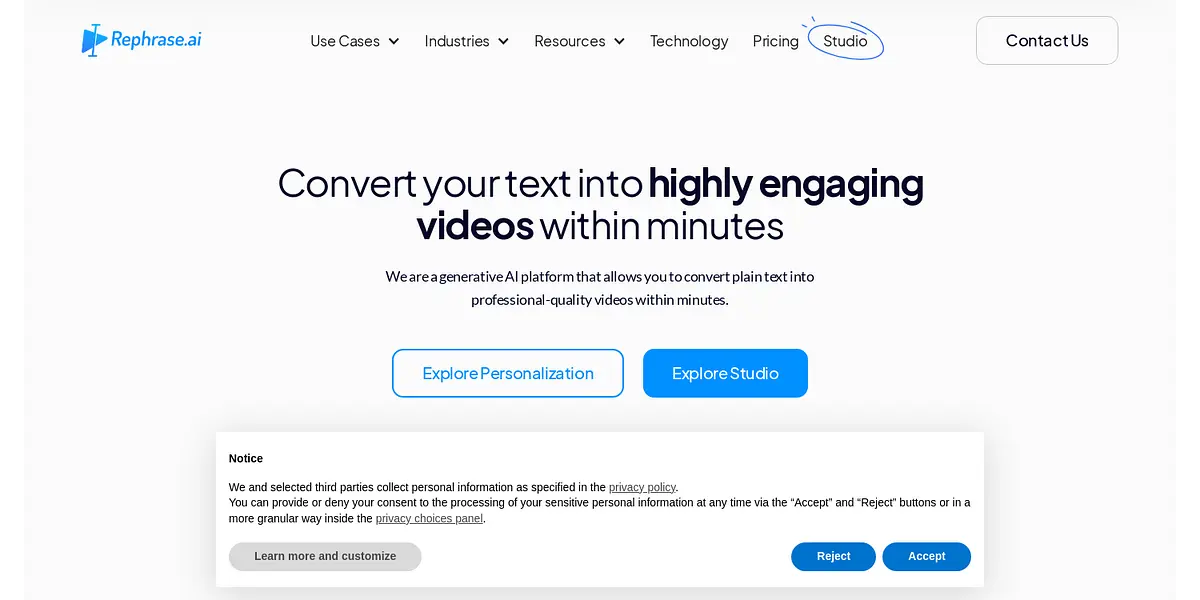 Rephrase.ai is a cutting-edge generative AI platform that enables you to transform your plain text into high-quality videos in just a few minutes. Our platform uses artificial intelligence and machine learning techniques to generate professional-grade videos that you can use for a variety of applications, from digital marketing to social media and more.