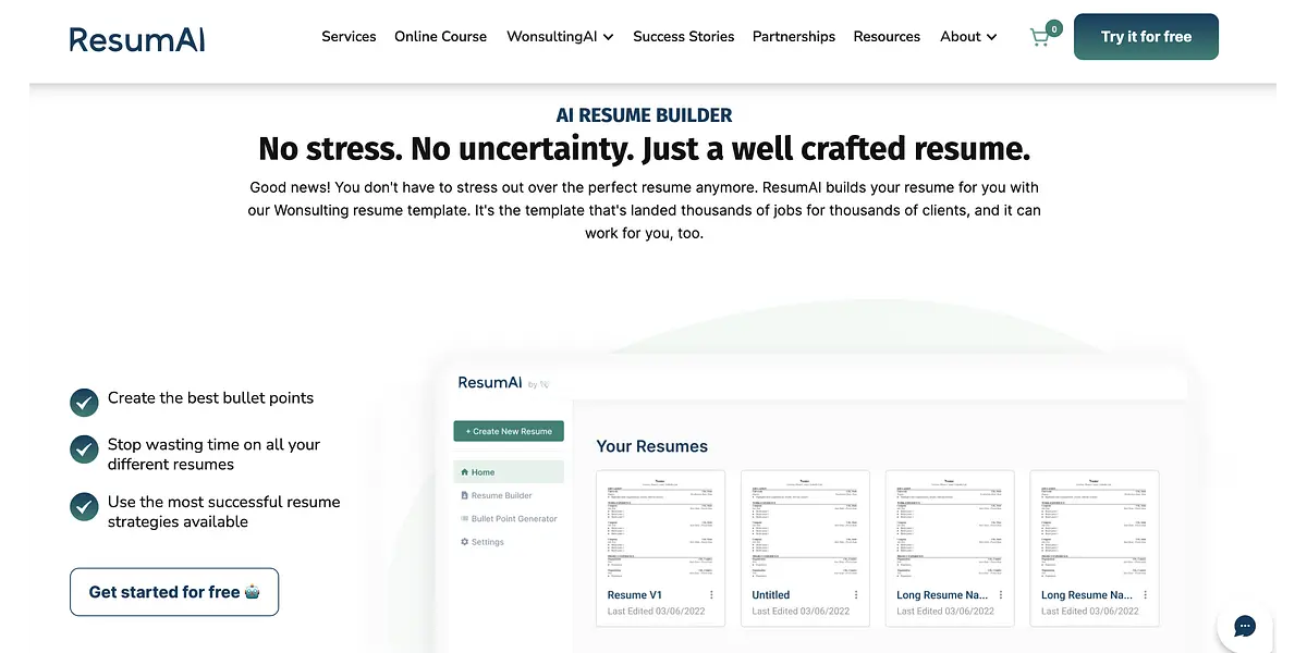 ResumAI by Wonsulting is a revolutionary AI-powered resume builder that can create your entire resume in just minutes. All you have to do is answer a few questions about your work experience, skills, and education, and ResumAI will do the rest. It uses the latest machine learning technology to analyze your responses and create a customized, professional-looking resume that highlights your strengths and achievements.