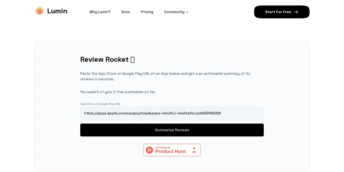 Lumin is a review summarization tool that provides actionable insights to improve your app's performance. With Review Rocket, paste the App Store or Google Play URL and get a summary of user reviews in seconds. Lumin offers 2 free summaries to get you started.