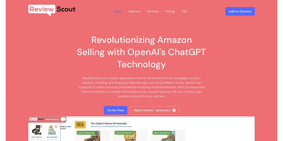 ReviewScout is a game-changer in the world of Amazon selling, powered by OpenAI's ChatGPT technology. With a mission to revolutionize the Amazon experience, ReviewScout offers a suite of AI-driven tools that empower sellers, resellers, and shoppers alike. We provide the data and insights you need to stay ahead of the competition, make informed decisions, and optimize your Amazon business strategies for success.