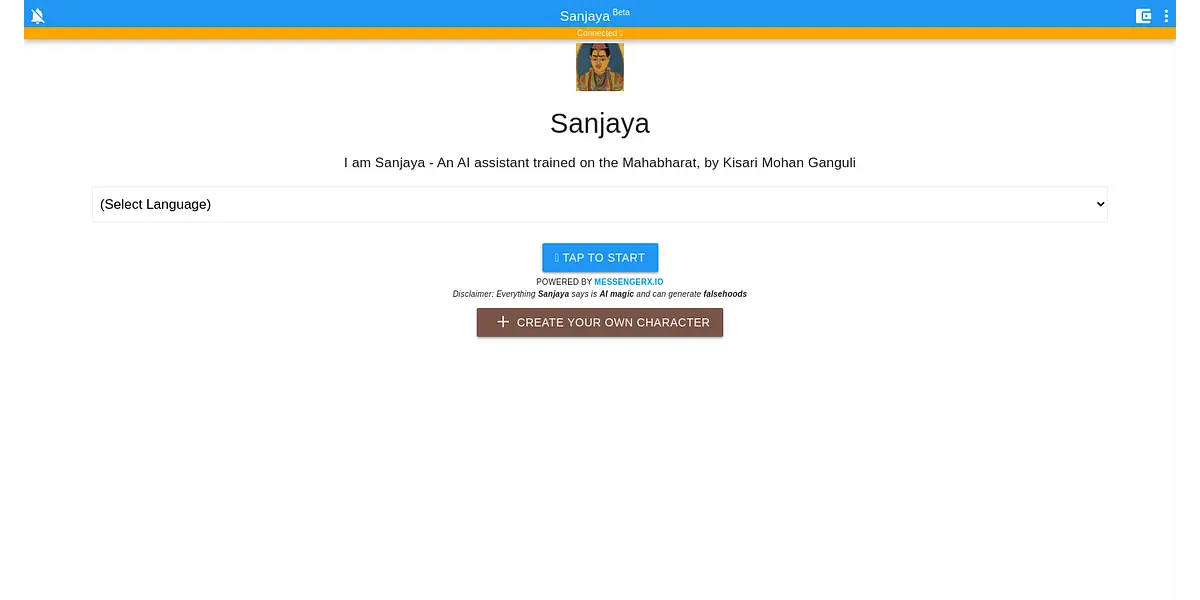 Sanjaya Beta Connected is a one-of-a-kind AI assistant trained on the Mahabharat, an epic narrative that has been inspiring generations for centuries. Developed by Kisari Mohan Ganguli, Sanjaya AI Assistant is a revolutionary creation that brings the ancient wisdom of the Mahabharat to life in a never-before-seen way.