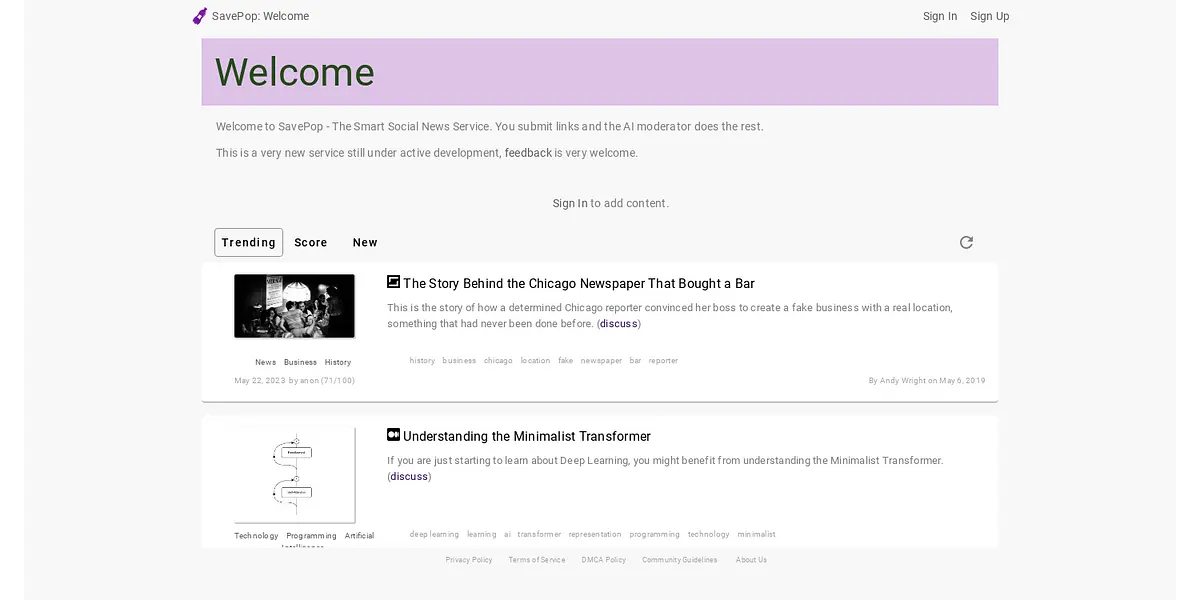 SavePop is the ultimate social news service where you submit links and the AI moderator does the rest. It's the smart way to stay updated on everything that matters, without the hassle.