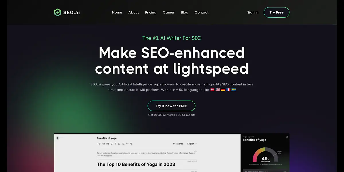 Make SEO-enhanced content at lightspeed with SEO.ai - the #1 AI writer for SEO. Get artificial intelligence superpowers to create high-quality SEO content in less time and ensure it will perform. Works in over 50 languages.