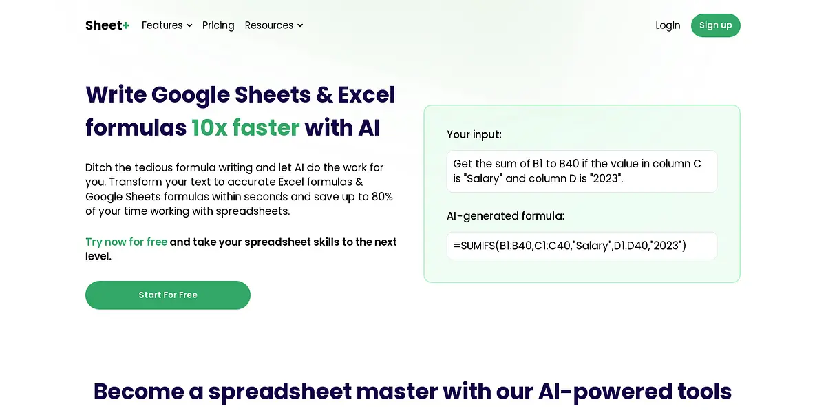 Say goodbye to tedious formula writing and hello to AI-generated formulas in seconds with Sheet+. Enhance your spreadsheet skills and save up to 80% of your time. Try it for free and become a spreadsheet master today.