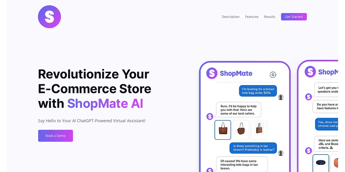 Unleash the Power of AI and ChatGPT for Your E-commerce Store with ShopMate. Maximize Your Sales with Upselling and Cross-Selling, and Cut Costs with 24/7 Support. See Real Results with ShopMate. Book a Demo Now!