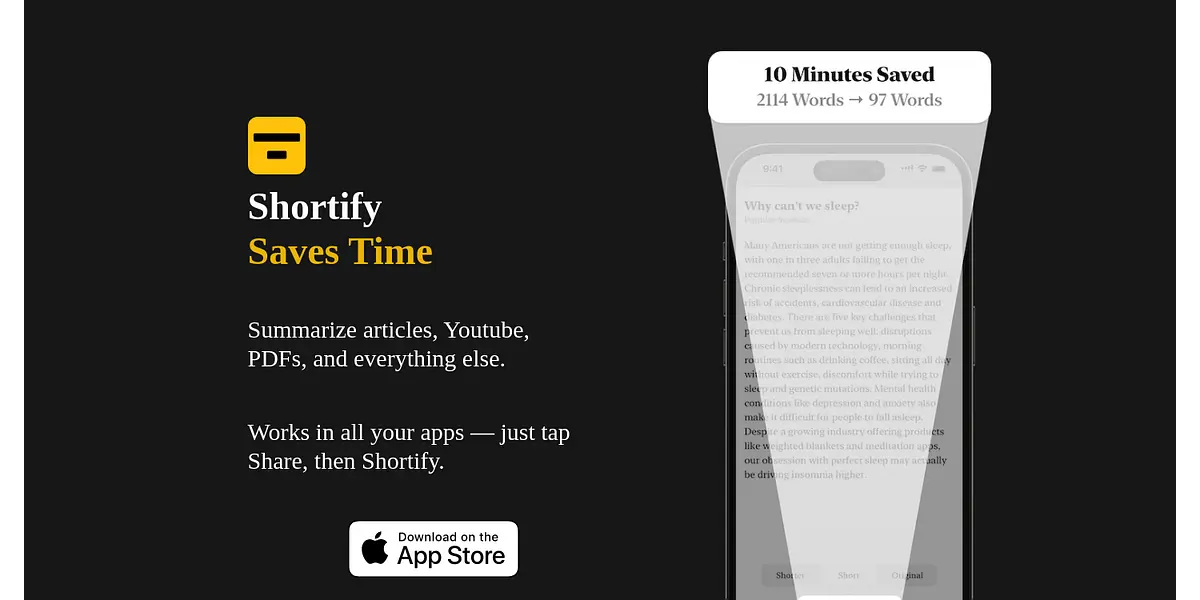 Shortify is an app that saves you valuable time by summarizing articles, YouTube videos, PDFs, and other content. Just tap on Share and tap Shortify to get a shorter version of any content. With Shortify, you can get through your backlog of 500 tabs, read blog posts or think pieces with too much history, or skip ads/plugins.