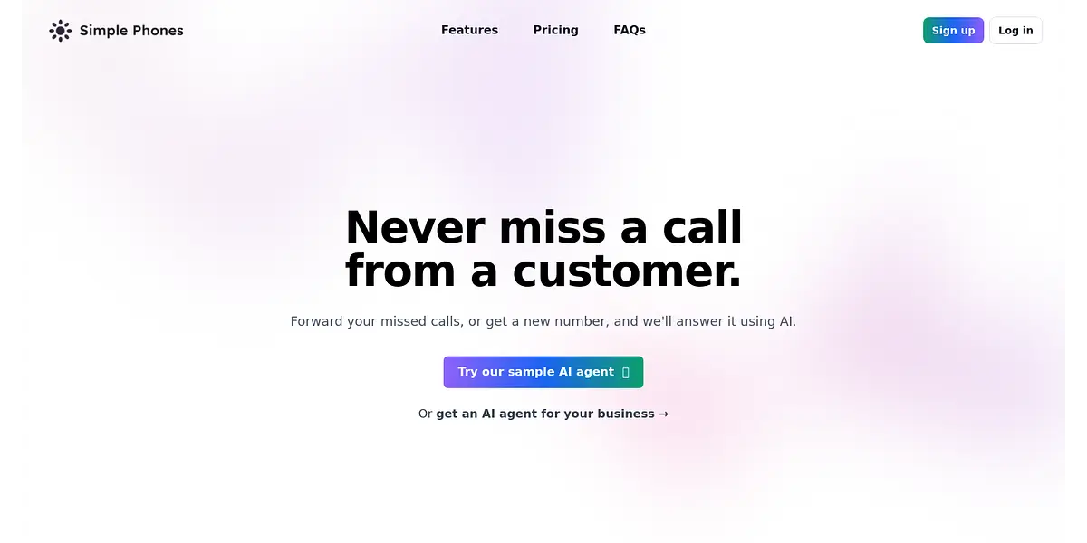Our sample AI agent is available for you to try out today, and if you like what you see, you can get one for your own business. With Simple Phones, you'll never have to worry about missed calls again.