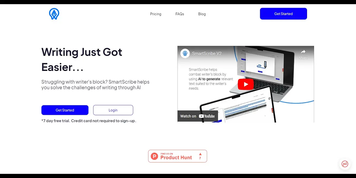 SmartScribe is an AI-powered writing tool that offers efficient paraphrasing, plagiarism scanning, and research curation for writers facing writer's block or struggling with clarity in their writing. With SmartScribe, effortlessly enhance your writing and uncover deeper insights on any topic or subject area. Join now for a 7-day free trial!