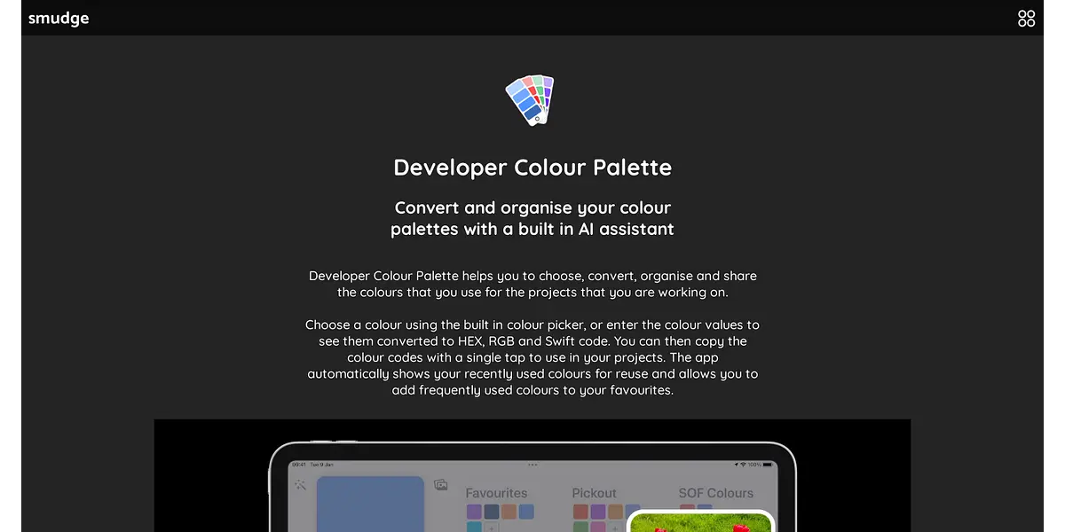 Convert, organise, and share your colours easily with smudge Developer Colour Palette. With its built-in AI assistant and features like colour extraction and palette creation, this app streamlines your color selection process for all your project needs. Available on iPad, iPhone, and Mac.