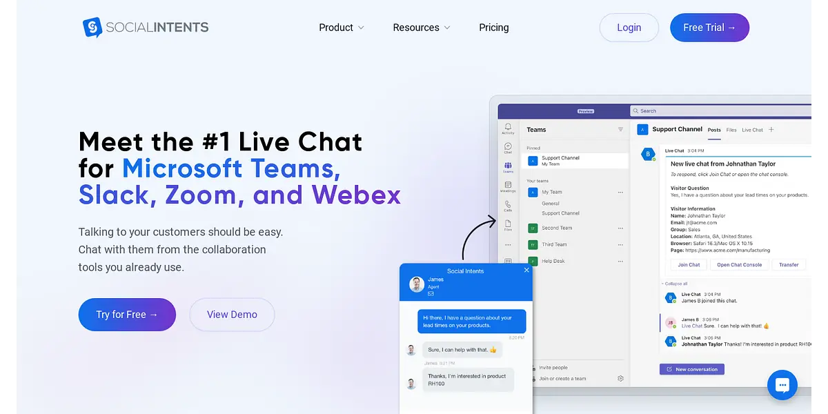 Social Intents Live Chat is a powerful chat solution for businesses that want to connect with their website visitors from the collaboration tools they already use. With Social Intents, businesses can easily provide real-time customer support directly through Microsoft Teams, Slack, Zoom, Webex or our web-based chat console, without the need to learn additional software.