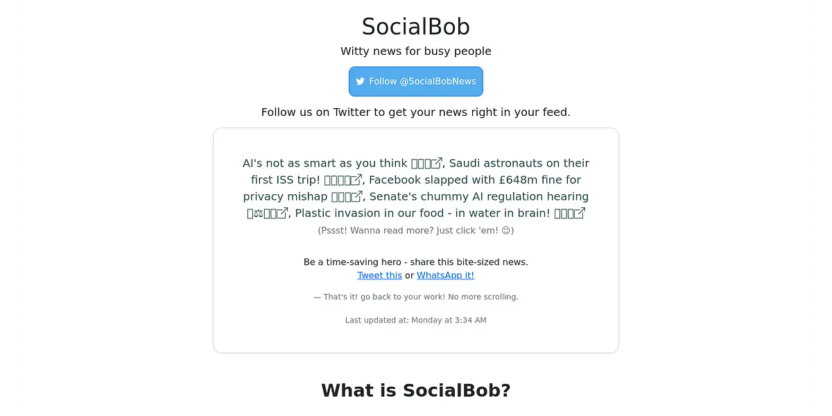 SocialBob is an AI-powered news platform, that delivers positive and witty news bites for busy people. Stay informed and start your day with a smile, not stress. Condensed news summaries, customizable news feed, and tailored to your location. Join the waitlist now and be a time-saving hero.