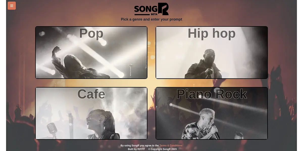 SongR helps you create the perfect playlist for any mood or genre. Just pick a genre and enter your prompt, and SongR does the rest! Built by RIFFIT, SongR is the one-stop destination for all your music needs.