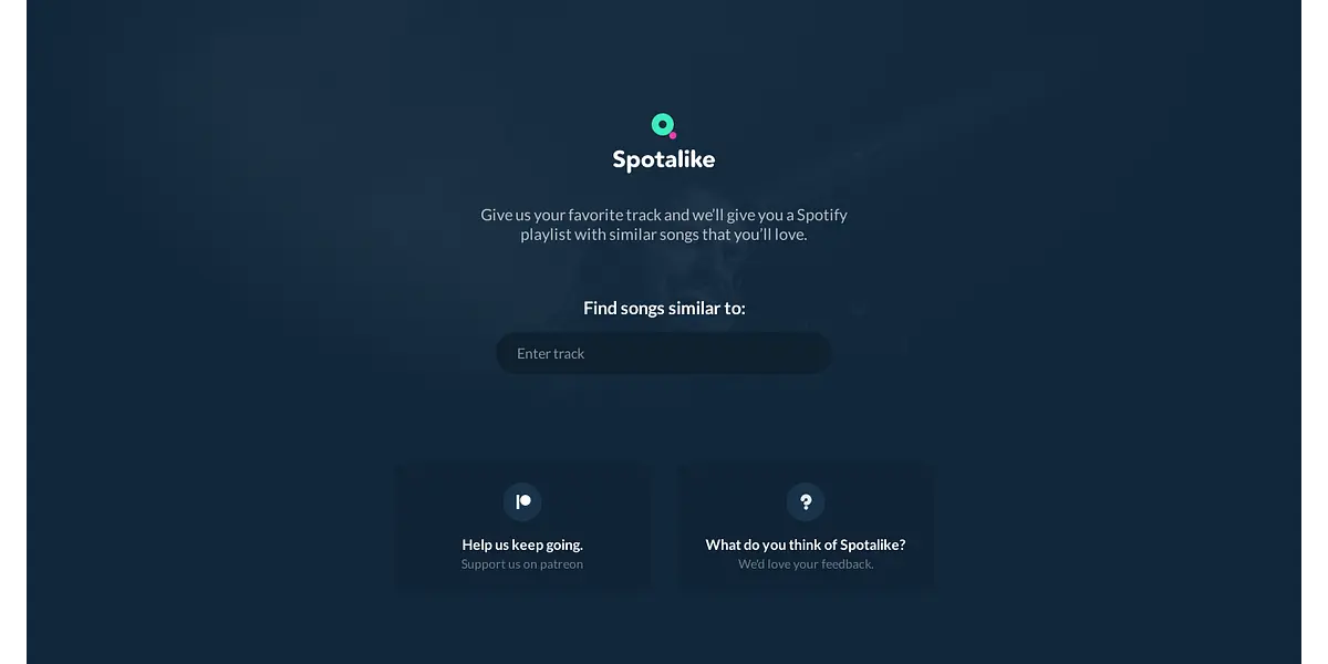 Spotalike helps music lovers find similar songs to their favorite tracks by creating Spotify playlists they'll love. Simply provide your favorite track, and Spotalike will do the rest. Support the platform on Patreon and share your feedback on the user experience. Spotalike also uses cookies for personalization and analytics.