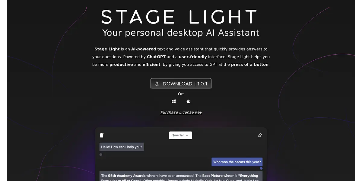 Boost your productivity and efficiency with Stage Light - an AI-powered text and voice assistant that provides quick answers to your questions. Designed with a user-friendly interface and powered by ChatGPT, Stage Light is available for download or purchase of license key.