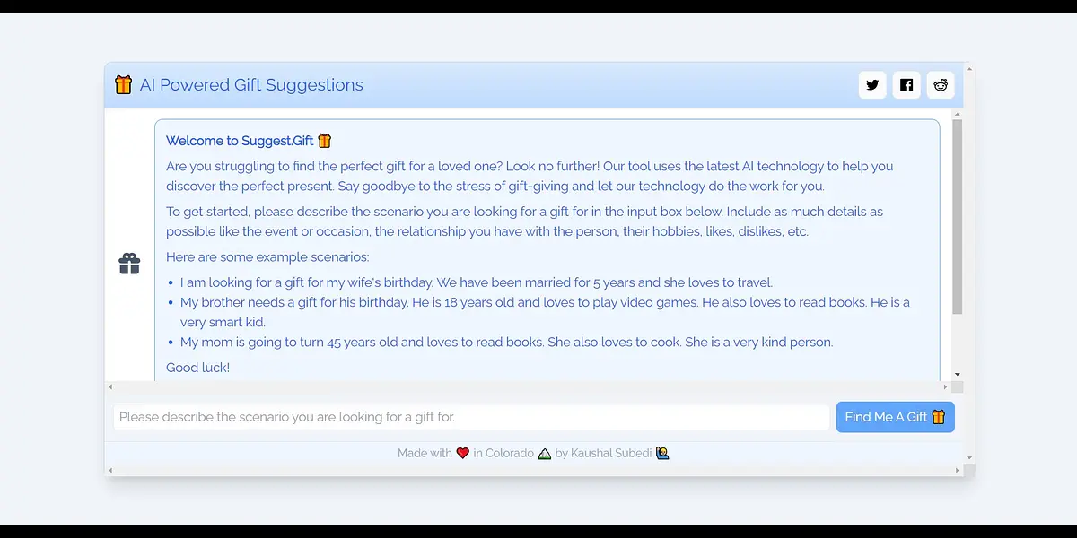 Created in Colorado with love by Kaushal Subedi, Suggest. The gift is more than just a gift suggestion platform. We are dedicated to making gift-giving easier and more enjoyable, so you can spend more time with your loved ones and less time stressing over the perfect gift. Our platform is always evolving, and we are constantly updating our AI technology and algorithms to ensure that our gift suggestions are always personalized and unique.