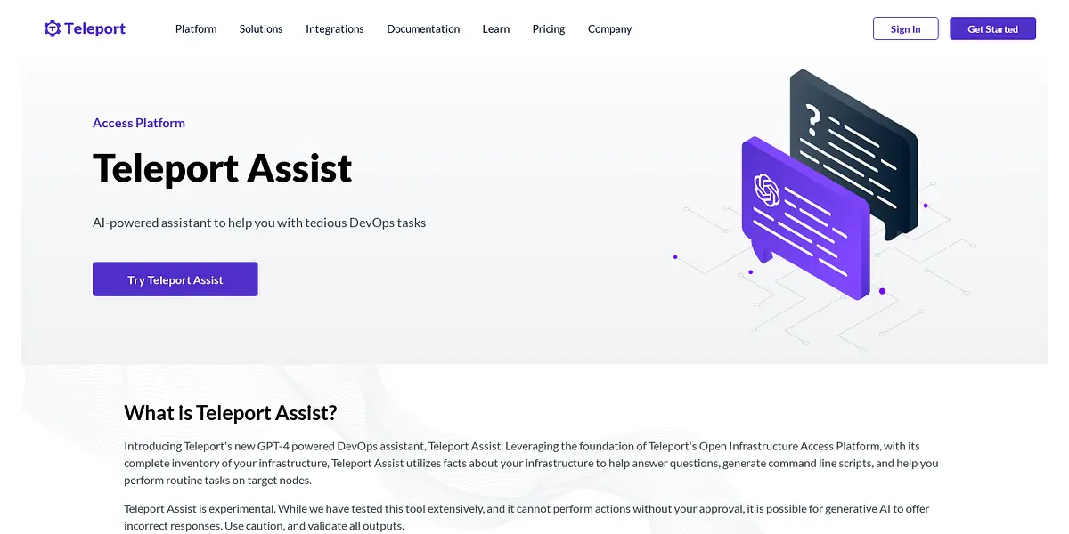 Teleport Assist is the newest experimental DevOps assistant that is designed to help infrastructure management through GPT-4 powered generative AI. It is a part of Teleport's Open Infrastructure Access Platform, which provides a complete inventory of your infrastructure allowing Teleport Assist to interpret natural language, quickly generate commands to answer common questions and suggest scripts. With Teleport Assist, you can easily perform routine tasks on target nodes.