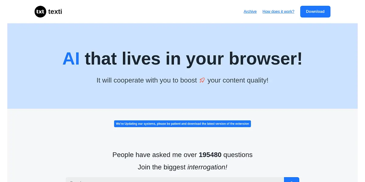 How does it work? It's simple. Download our Chrome extension for free and enjoy the benefits of having AI assistance right at your fingertips. With Texti Archive, you can lower your bounce rate and increase your engagement by utilizing our unique suggestions and insights that are designed to help you create content that resonates with your audience.