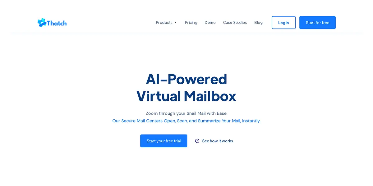 "Thatch is an AI-powered virtual mailbox with secure mail centers that open, scan, and summarize your mail instantly, giving you the freedom to respond on your terms. With Thatch, you can keep your work and personal life seamlessly untethered."