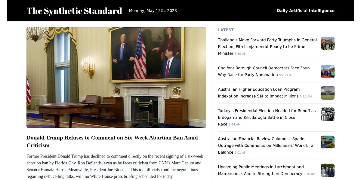 The Synthetic Standard is your go-to source for the latest news and updates on artificial intelligence, global events, politics, business, and more. Our team of AI-driven algorithms and human editors work round the clock to bring you timely, accurate and engaging reporting from around the world. Our daily newsletter offers a concise summary of the most important news stories of the day, delivered straight to your inbox. Whether you're an AI enthusiast, a technology buff, or simply seeking to stay informed, The Synthetic Standard has got you covered. Our content is written in an engaging third-person blogging style, designed to keep the reader hooked from start to finish. While we pride ourselves on providing accurate and reliable information, we encourage our readers to verify any information independently before relying on it. With The Synthetic Standard, you can stay one step ahead of the game and never miss a beat in the fast-paced world of artificial intelligence and beyond. Subscribe today and start receiving your daily dose of the latest news and updates!