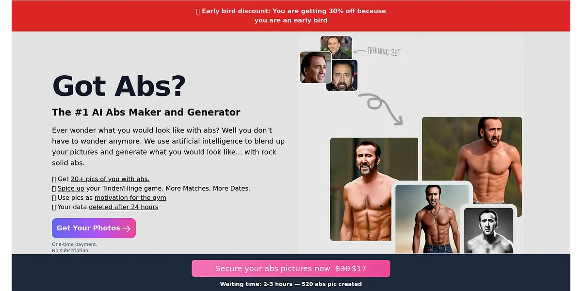 Want to see yourself with abs and give your dating profile a boost? AI Abs Maker and Generator use artificial intelligence to generate customized pictures of you with rock-solid abs. Spice up your social game, use the pictures as motivation for the gym, or impress your friends. Get 20+ customized pictures with a one-time payment and early bird discount.