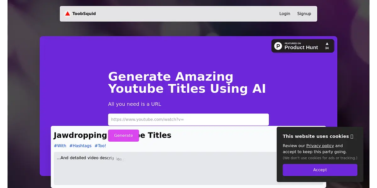 ToobSquid is the ultimate solution to enhance your YouTube presence. With just a URL and email, ToobSquid generates jaw-dropping YouTube titles with hashtags and detailed video descriptions. With advanced options, team access, and a convenient Chrome extension, ToobSquid takes your YouTube success to new heights.