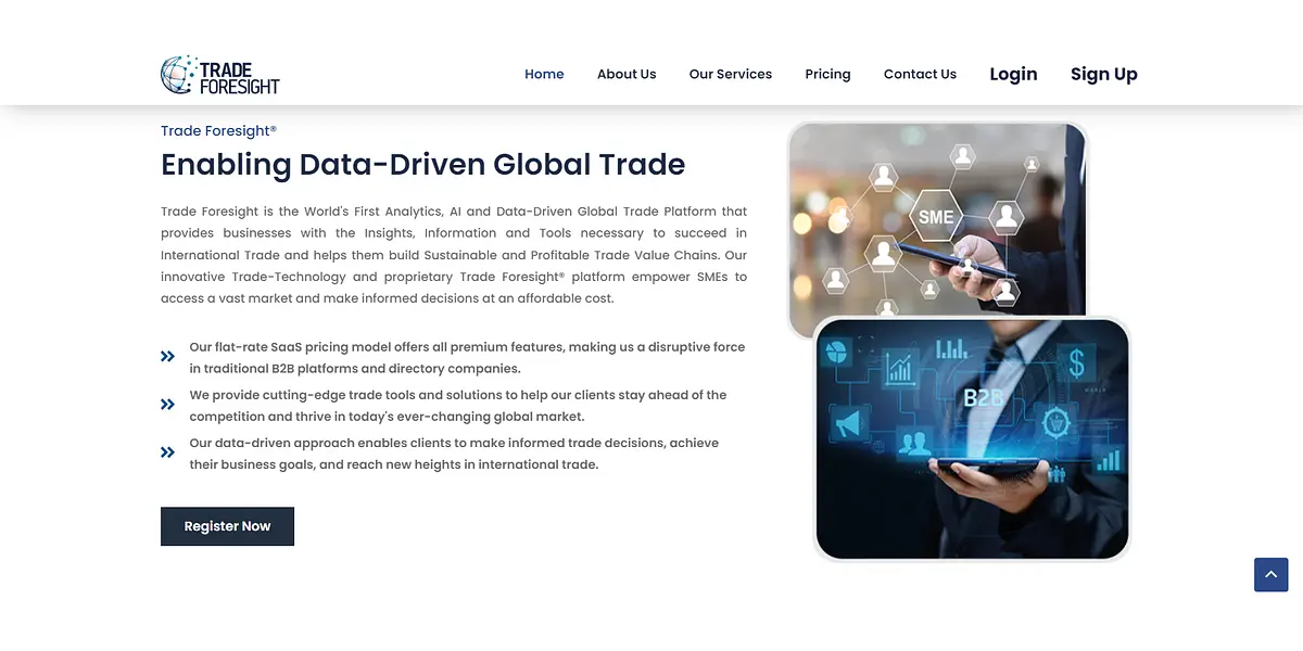 Trade Foresight is a complete global trade intelligence platform designed to help businesses grow and expand worldwide using AI-driven tools and valuable insights. From discovering new markets to analyzing products or industries, our comprehensive platform provides everything businesses require to expand their operations worldwide.