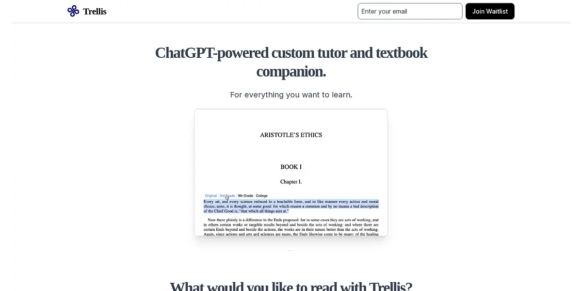 Trellis is a revolutionary concept in the world of learning. It is a custom tutor and textbook companion that simplifies the learning journey for students. With Trellis, students no longer need to feel embarrassed to ask questions, as they get a Socratic Guide to teach them the material. This guide can even quiz the students to test their understanding. Trellis simplifies and explains any diagram, making it easy for students to understand hard science, engineering concepts, code, and mathematics. Education is transformed, as students can now learn faster and with more depth, all for free.