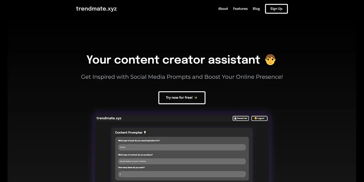 Trendmate.xyz is a cutting-edge content creation assistant that helps you overcome writer's block and generate inspiring ideas for your online presence. Whether you're a blogger, influencer, or marketer, trendmate.xyz makes social media prompts accessible from all devices and offers a simple user interface that saves your favorite ideas for later use.